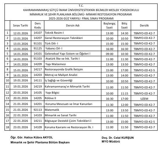 29.12.2025 - 2025-2026 Güz Yarıyılı Final Sınav Takvimi