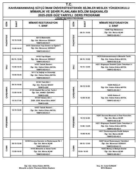 09.10.2025 - Mimari Restorasyon Programı Güz Dönemi Ders Programı